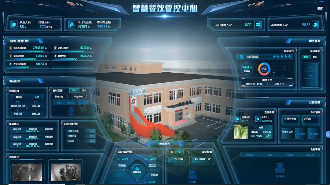 它是面向各级餐饮管理者的便捷监管界面,通过构建数字化协同监管场景,大幅度提升信息化服务体验,让人享受数字化带来的便利高效监管,打造餐饮新型监督管控体系。驾驶舱大屏幕真实呈现了餐厅运行全貌,以数字化形式映射餐厅整体运行情况,如:餐厅基本概况、行为监控、健康晨检、食品留样、违规抓拍等。