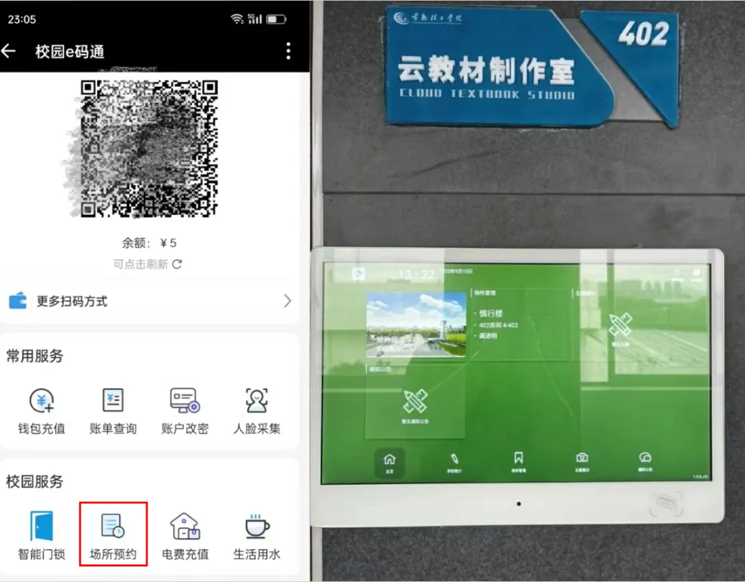 在“校园e码通”的“场所预约”应用中,用户可以查看可预约开放的场所并进行在线预约。预约成功后,相关场所对应的电子班牌将展示预约信息,同时门禁和门锁系统也会下发相应预约人的权限,确保其能够顺利进入场所。