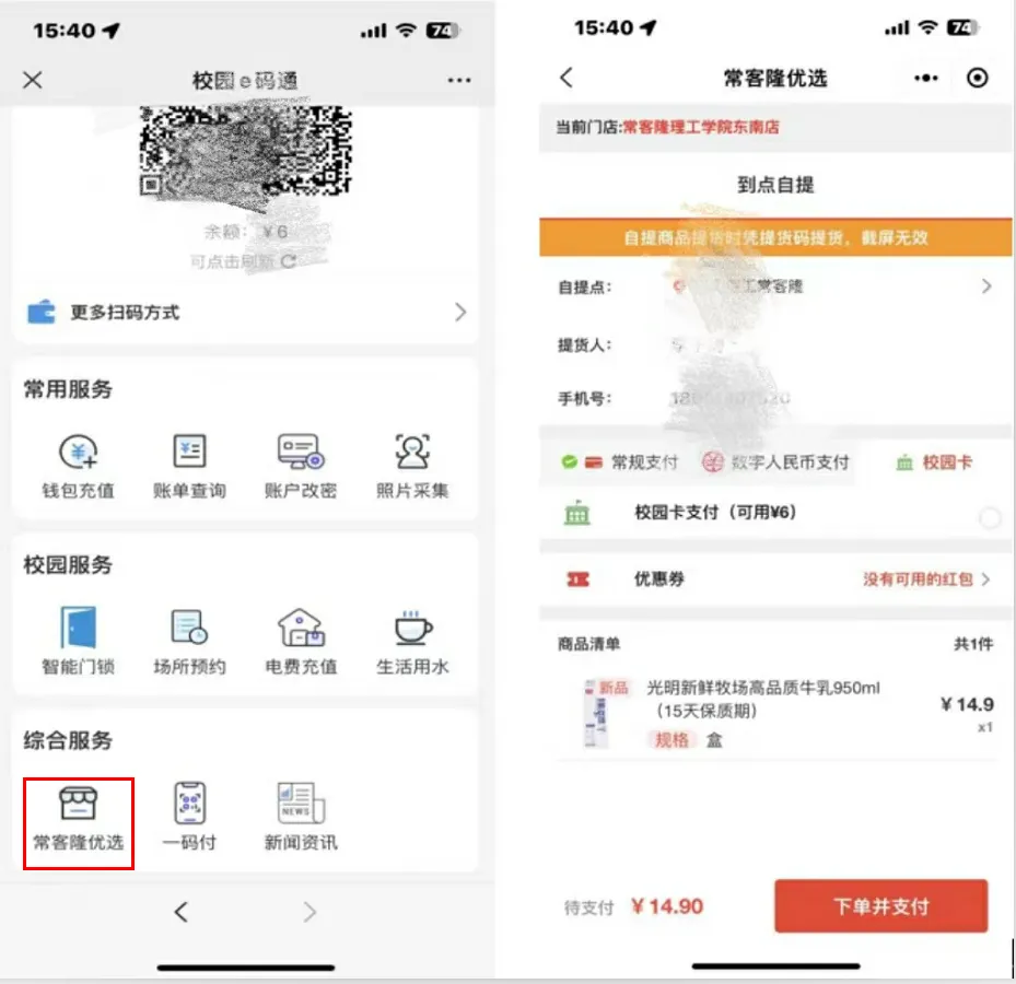 “校园e码通”中上线了“常客隆优选”,师生可通过线上自助选购下单完成支付,线下自提无需等待,大大提高了购物的便利。