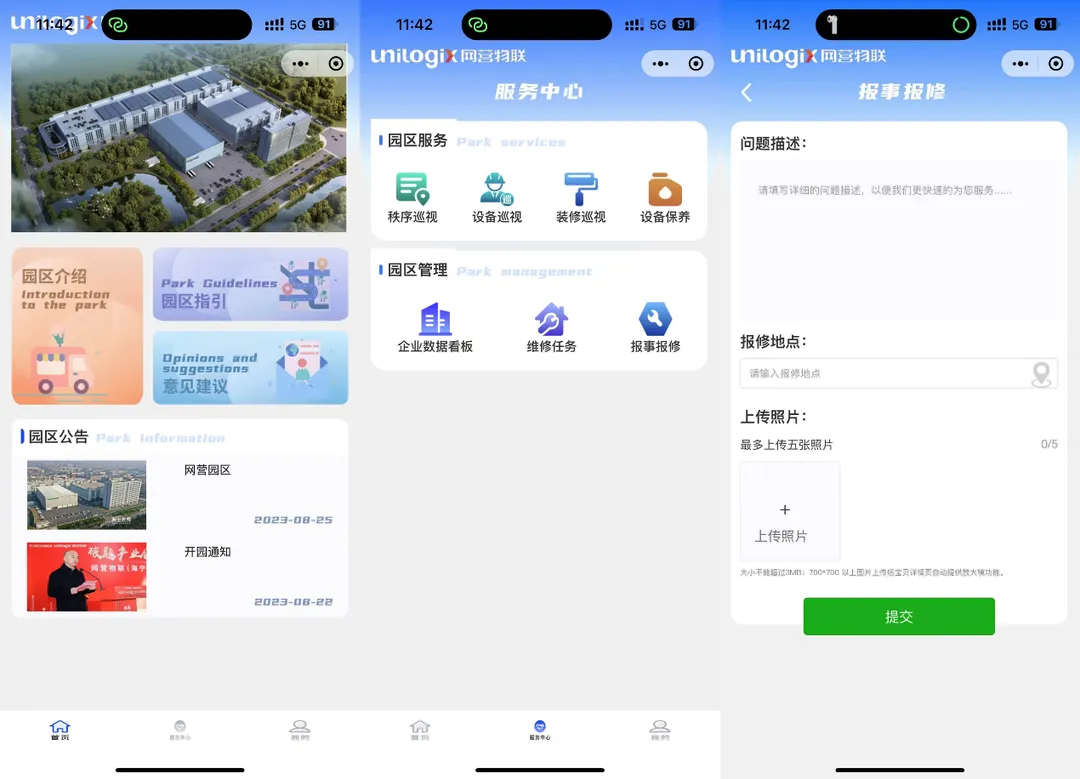 为了便捷移动管理,平台推出了移动端应用小程序,面向园区用户提供移动端办公、申报、审批、报修、查阅、访客预约等服务。小程序所提供的便捷、快速、轻量级的服务,受到了用户的欢迎。