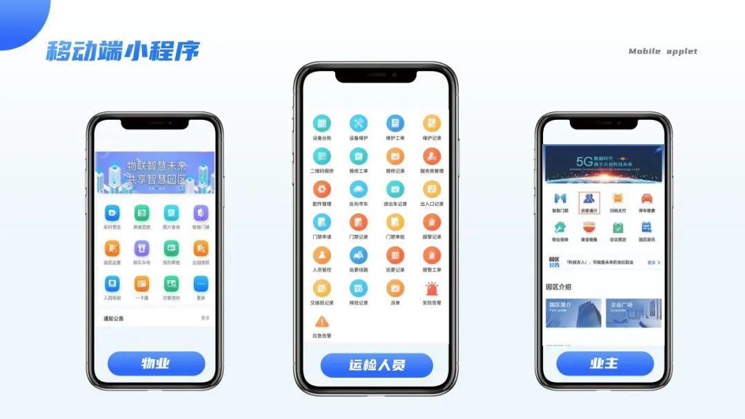 公司的智慧园区平台由“三平台一端”组成,分别是PC端的物联网平台、园区运营管理平台、驾驶舱平台以及移动端的小程序。